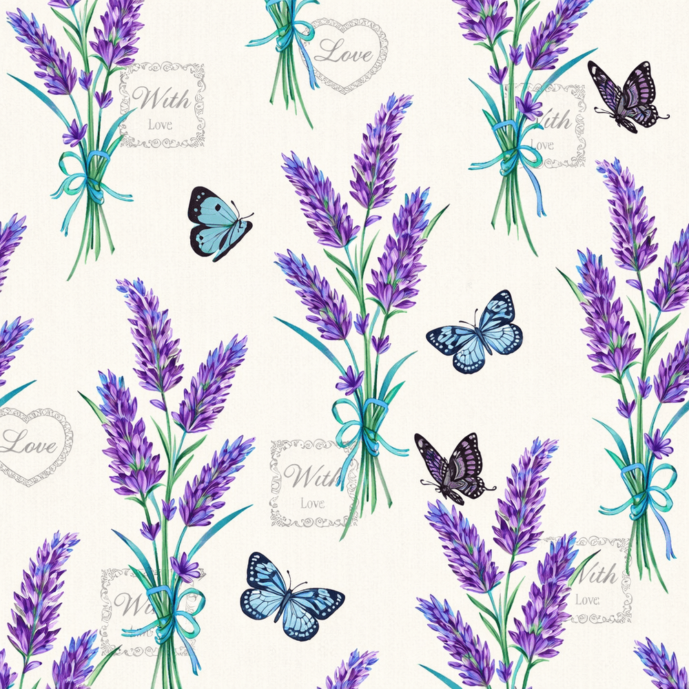 Guardanapo para Decoupage - Lavender With Love Cream Transforme suas peças com um visual delicado, romântico e atemporal usando o guardanapo Lavender With Love Cream . A estampa traz buquês de lavanda amarrados com laços azuis , borboletas e detalhes “With Love” em um fundo creme, perfeito para projetos com estilo provençal, shabby chic, rústico e floral .